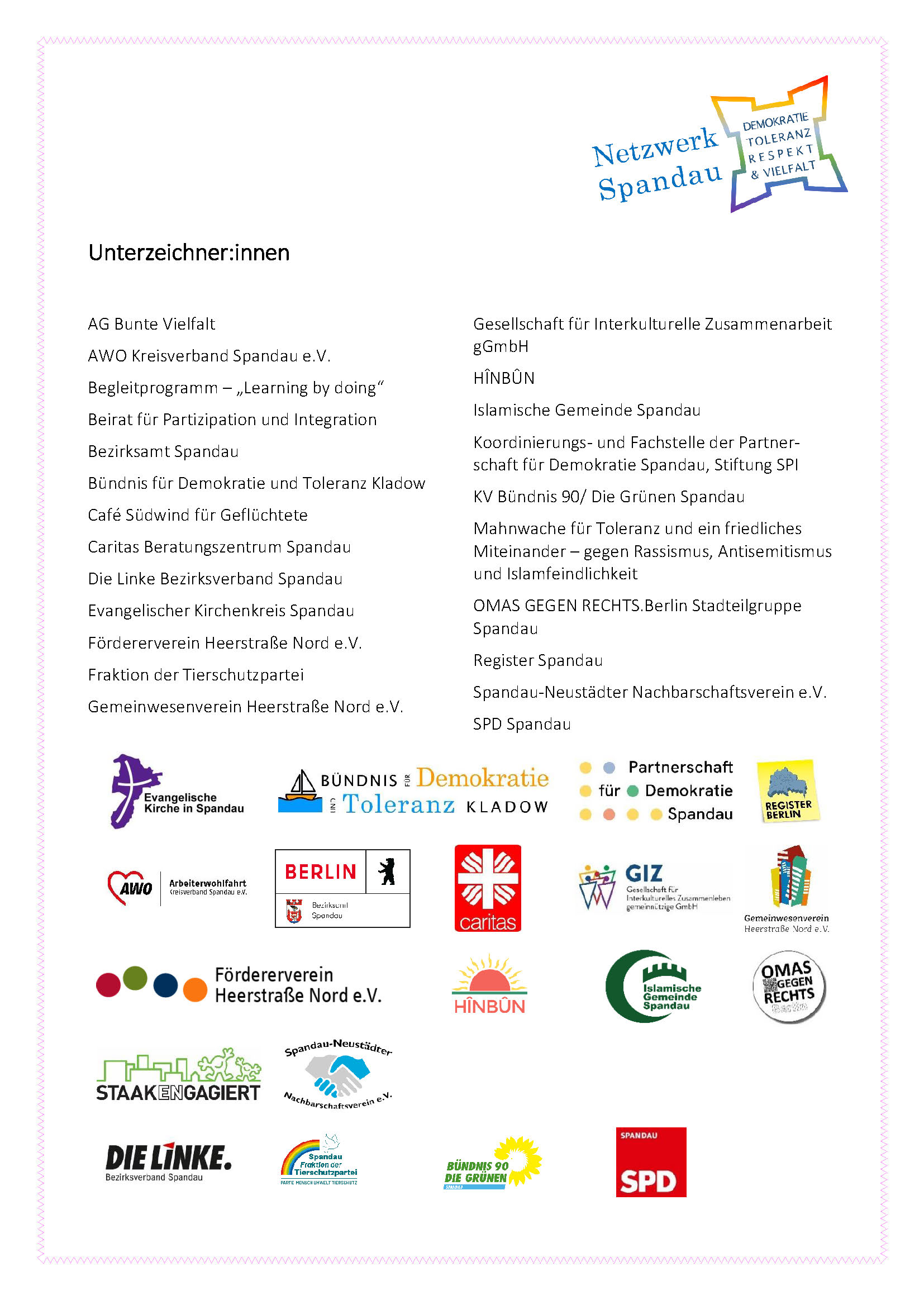 In gemeinsamer Initiative wurde eine Präambel erarbeitet, die auf der Gründungsfeier des Netzwerks  Demokratie, Toleranz, Respekt und Vielfalt Spandau am 7. April offiziell im Gemeindesaal in Sankt Nikolai am Reformationsplatz unterzeichnet wurde. Damit fiel der offizielle Startschuss zum gemeinsamen Handeln im Bezirk.